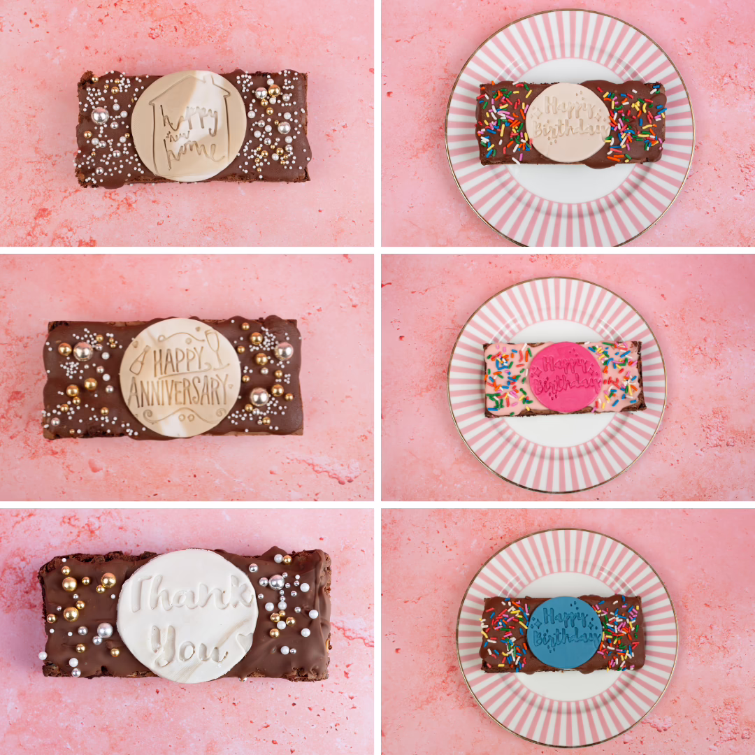 Look no further than our incredible Message brownie slabs, these slabs are 2.5 of our regular decadent brownie and are topped with delicious Belgian chocolate and a fondant stamp for all occasions.